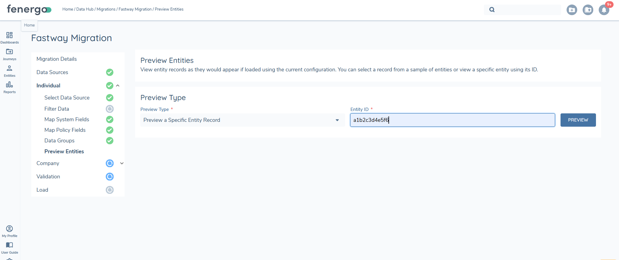 Once the preview is initiated, the system begins aggregating data and random set of 10 entities will be returned. Users can select any of these entities to view detailed information, ensuring that the applied transformations and data mappings are correct. The preview step is mandatory as it includes the data aggregration step.