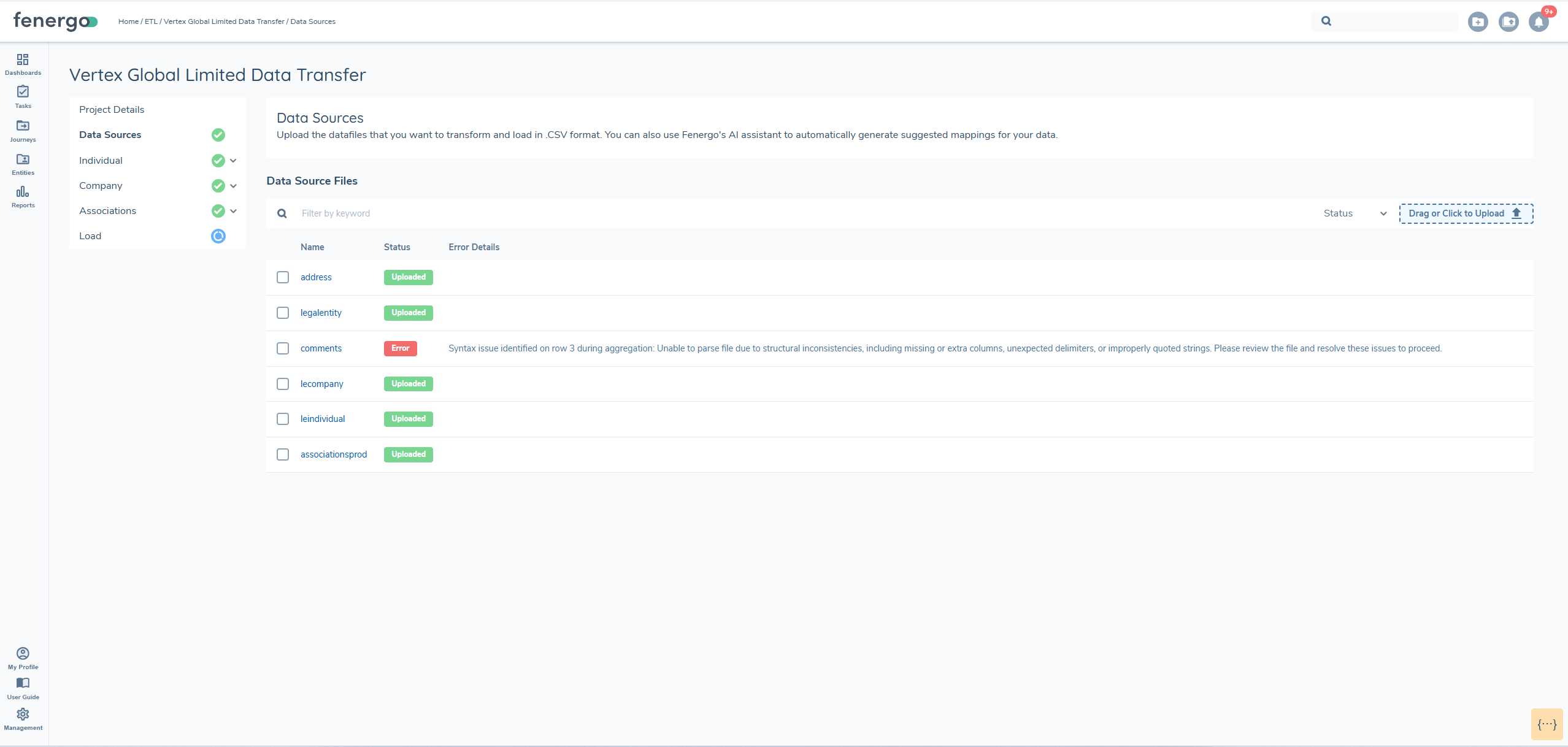 Once the load process is complete, a reconciliation report is generated for each entity. This report allows users to verify what was successfully loaded into FenX and determine whether entity creation or updates were successful