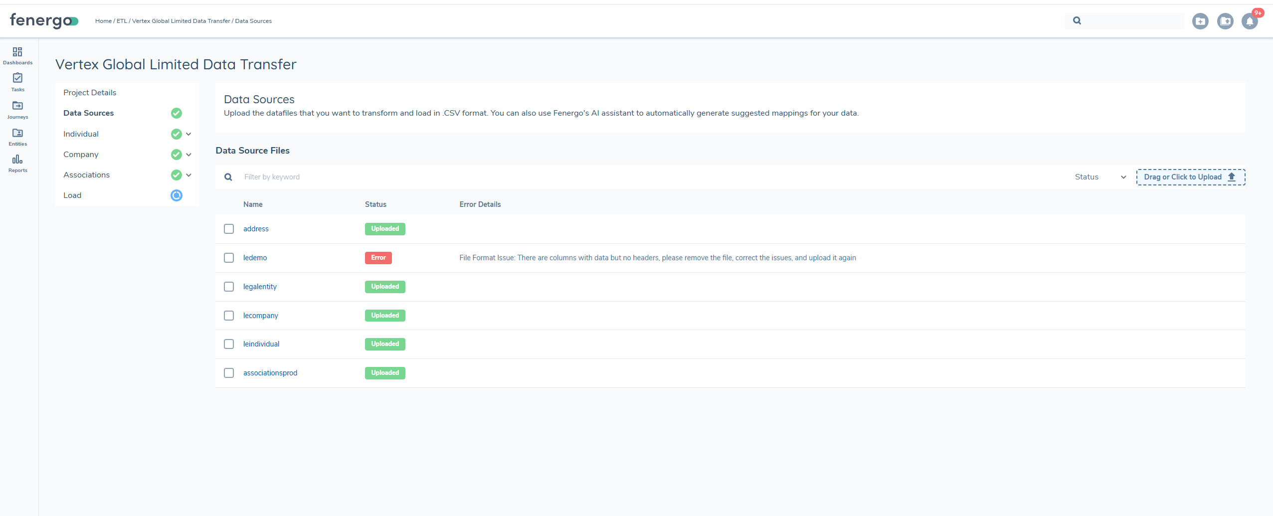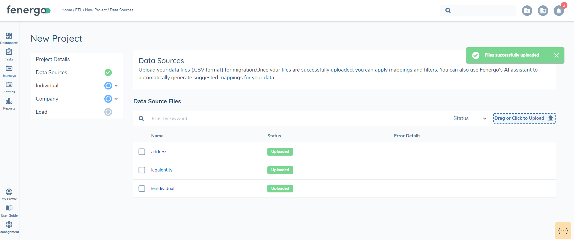 At least one file must be successfully uploaded before the section status updates to 'Complete', this will allow you to proceed with mapping. You can upload up to five files at a time, with a maximum number of entities in the files limited to 10000. All files must be in UTF format.