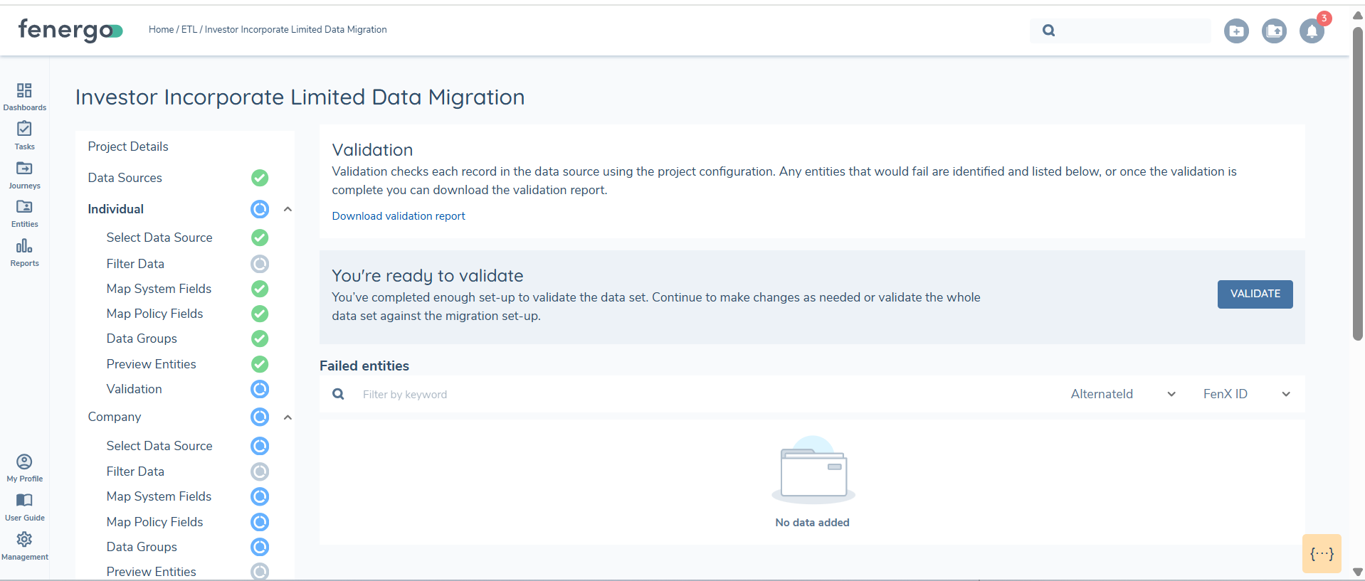 The validation option becomes available once the statuses for the mapping, filtering, datagroups and preview are all 'green' for a specific entity.