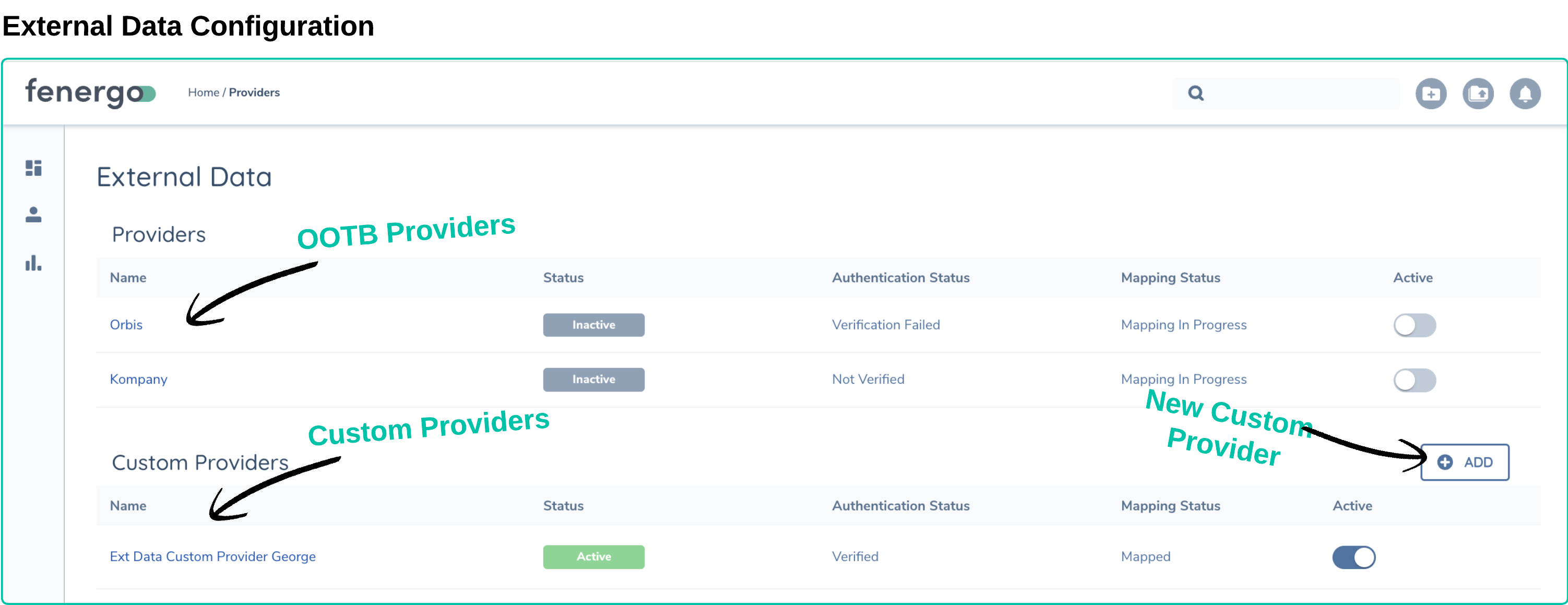 The Fenergo SaaS platform is designed to interact with external data sources. These could be dedicated external data providers like Kompany, or even an internal data authority, such as a Master Data Management (MDM) platform. Fenergo supports some external data providers right out of the box. Additionally, it offers clients the ability to use an Adapter to connect to their own data sources or other third-party providers.