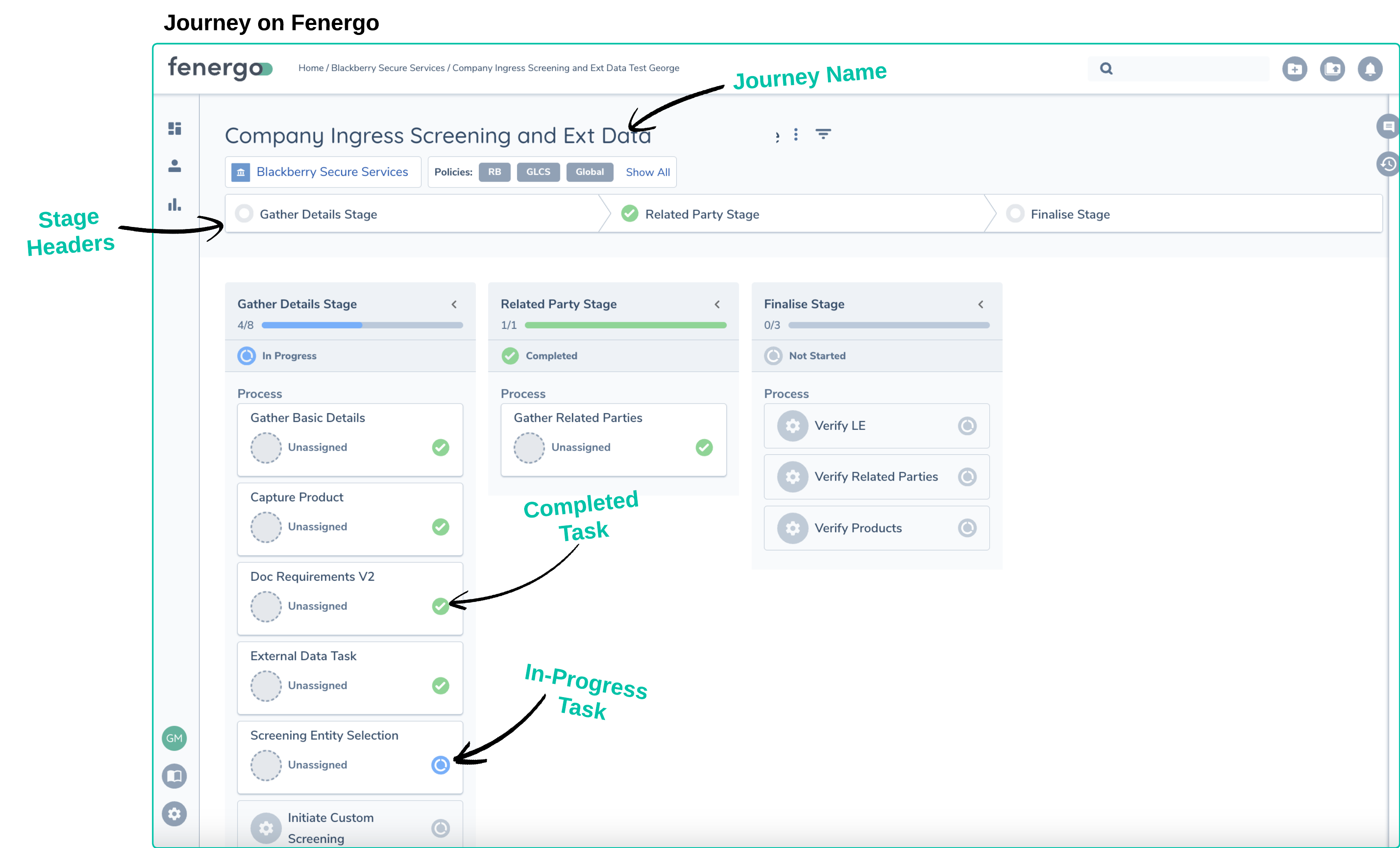 • In Fenergo, Journeys are made up of Processes, which contain Stages, which in turn contain Tasks.