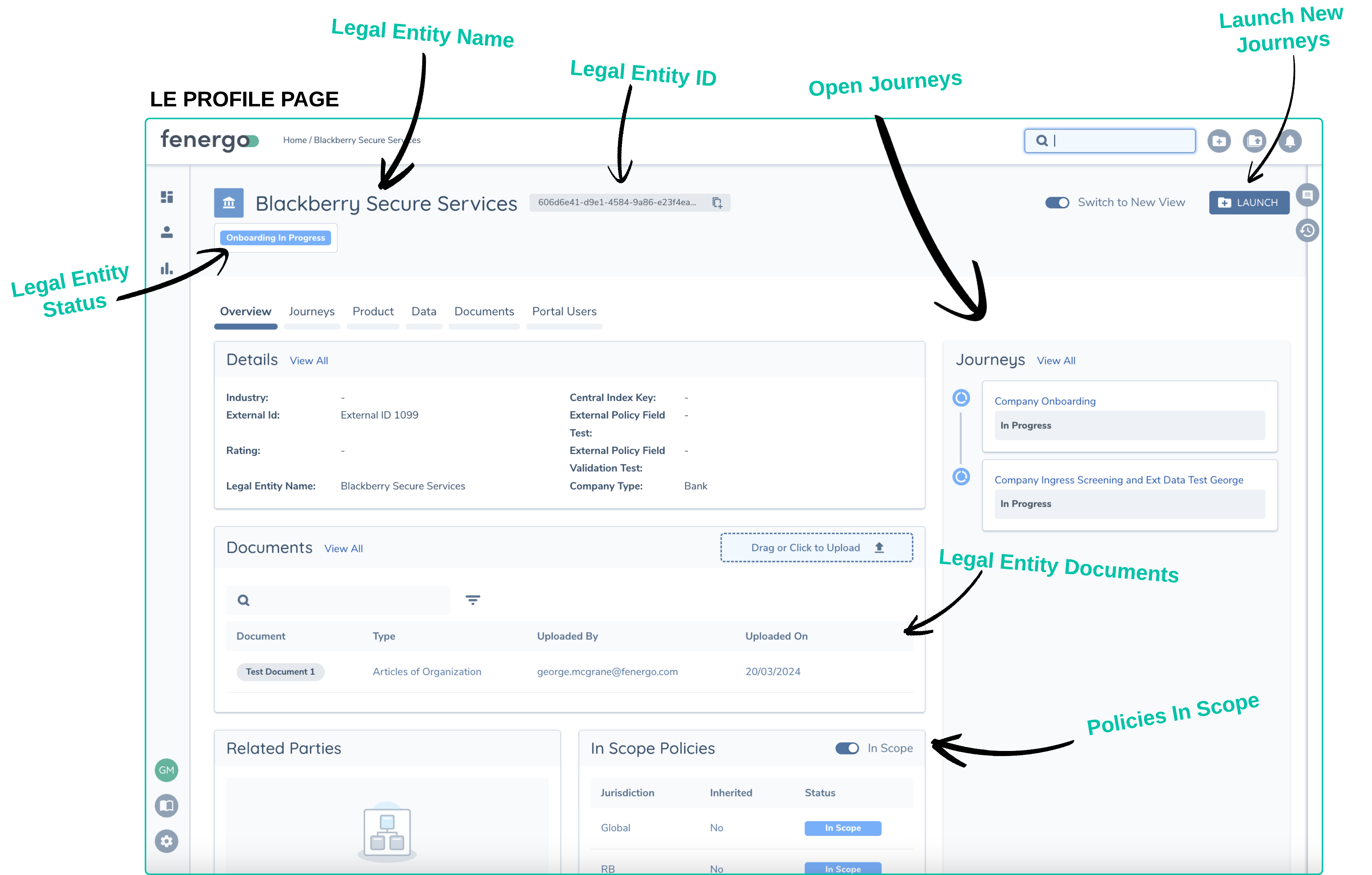A Legal Entity is shown in Fenergo on a page called the LE Profile page. This page displays all the data captured, relationships, products, and any open or completed Journeys for that Entity, provided the user has the appropriate access to view the record. Below is an example of an LE Profile Page.