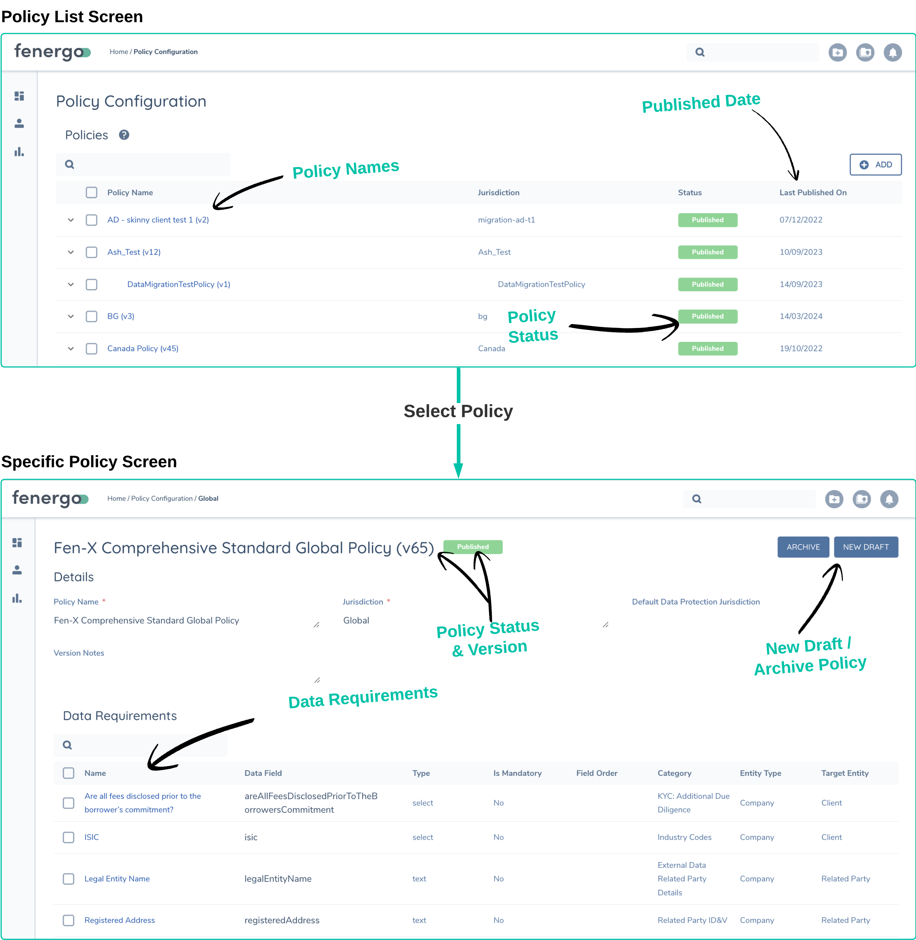 Policy Configuration is very specific to each Fenergo client's operating model requirements. However, the platform offers great flexibility in configuring Policies. So, no matter the scenario under which specific data needs to be gathered, the system can reflect those scenarios within Policy Config and scoping rules.