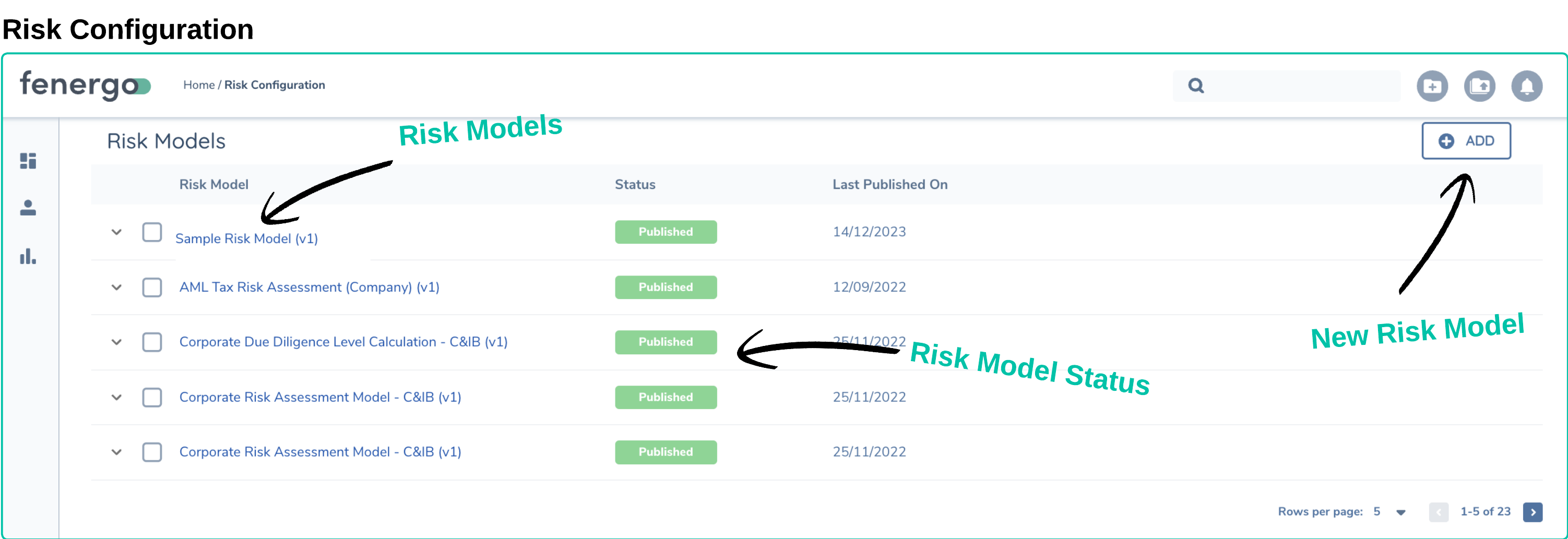 Fenergo includes a fully customizable risk engine. This allows clients to specify which data points (or risk factors) they want to use to measure risk. This risk calculation can be seamlessly integrated into a Journey as a task. The result of this calculation can then be used to guide the flow of the Journey, triggering conditional tasks and new policy requirements based on the risk outcome.
