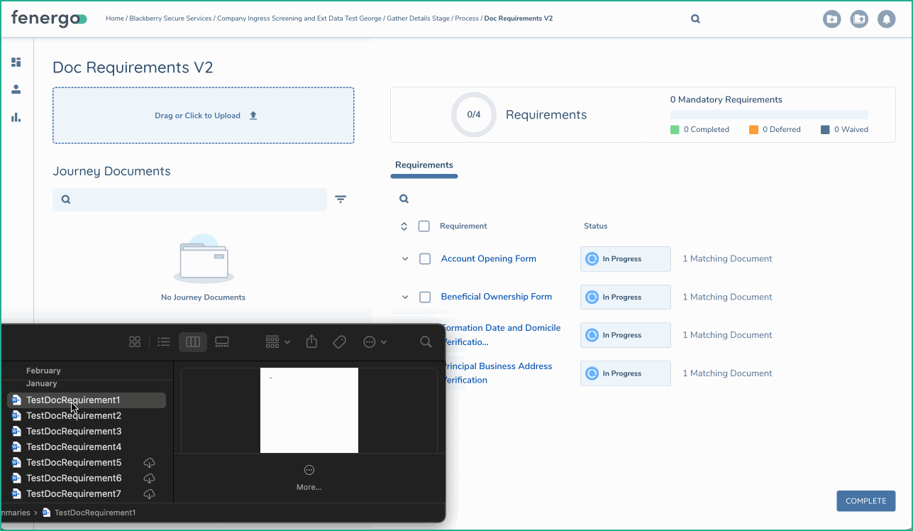Fenergo has made significant investments in this area to simplify the process of fulfilling document requirements. Building on the UI functionality mentioned above, a STATIC LLM model is used to automatically classify the documents uploaded against the requirements for a Legal Entity. This means that when you upload a document, the system can automatically determine which requirement the document fulfills, streamlining the process and saving you time.
